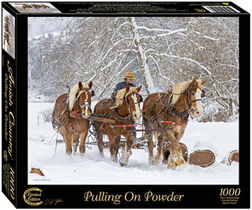 A team of Belgian horse pulling logs gliding over several inches of powered snow near Mound, Ohio